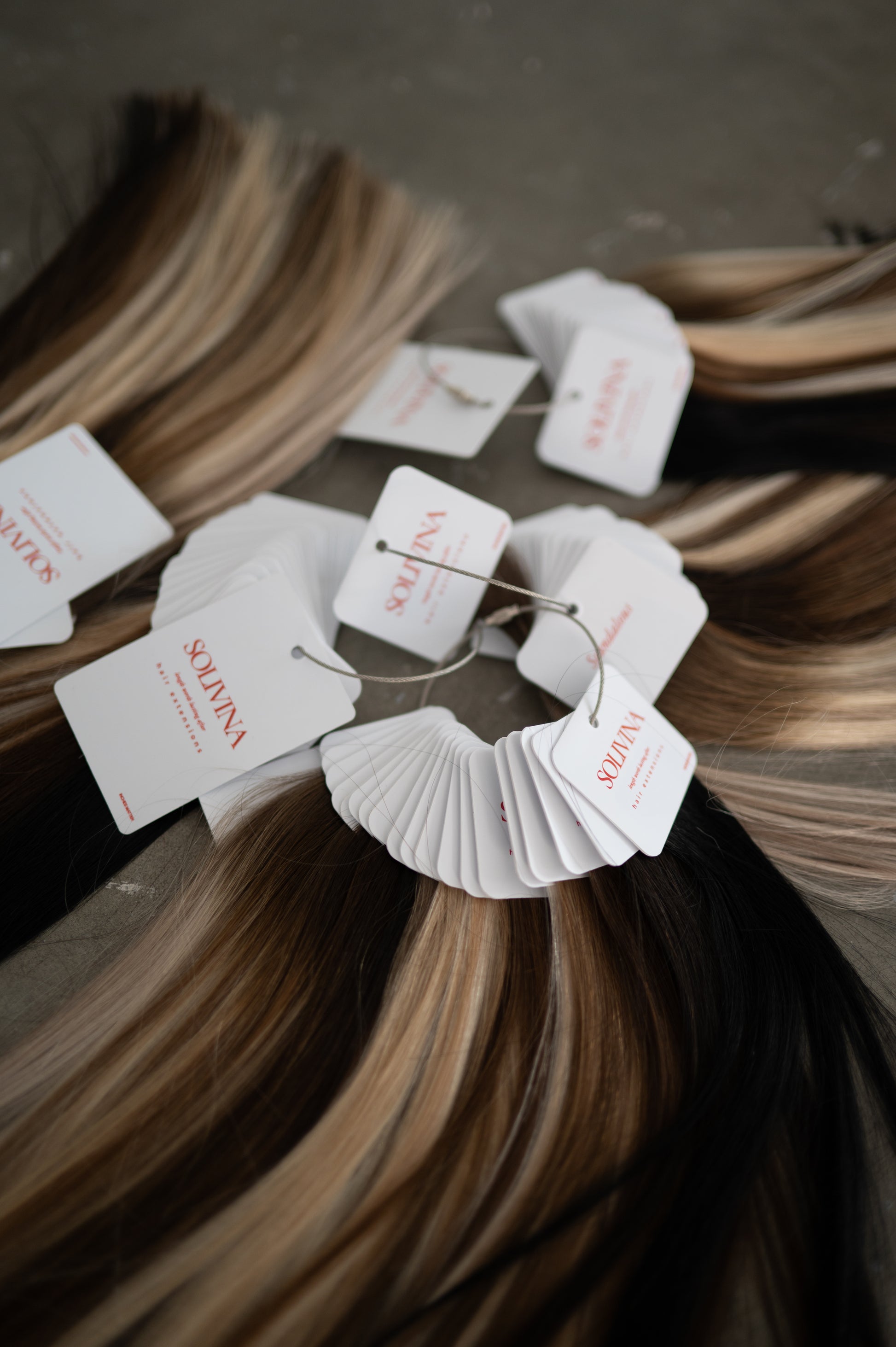 The Solivina Color Ring features all 21 luxury shades from our Sol-Tied (Genius Wefts) and Bonded (K-Tips) collections, crafted with 100% European human hair for accurate tone and texture matching. Each swatch is labeled for easy reference, helping stylists visualize dimension, root depth, and undertone in real life.