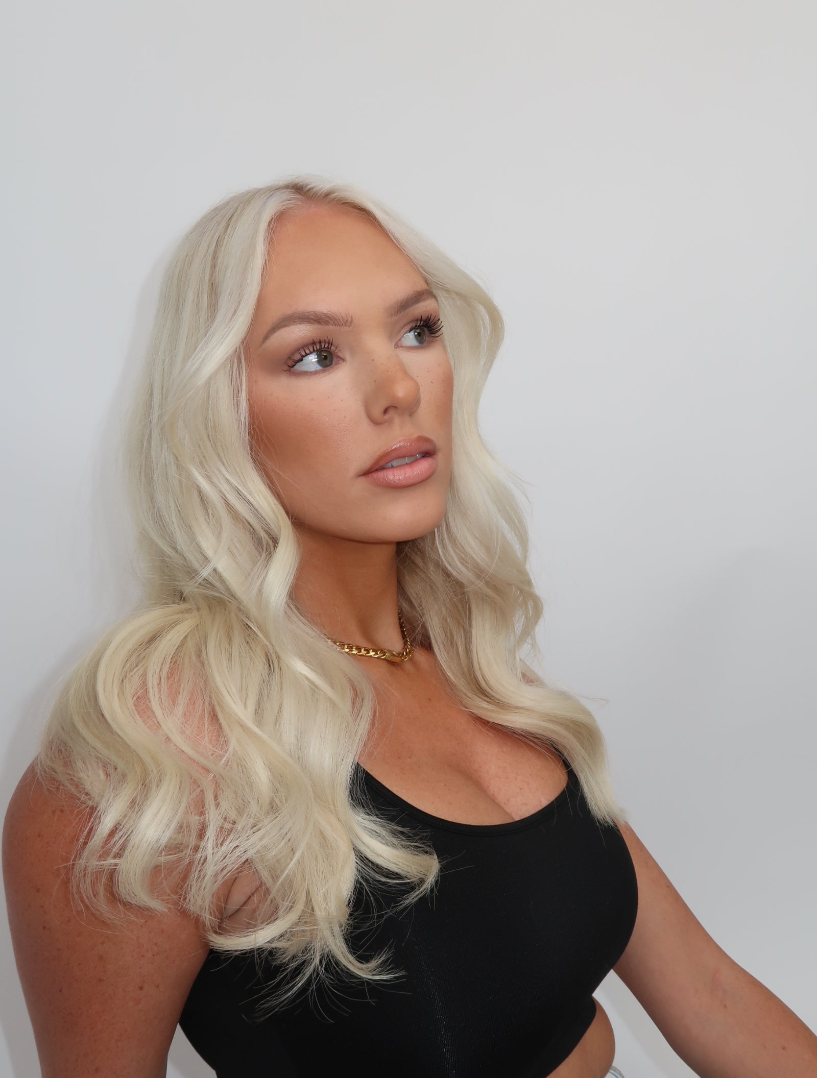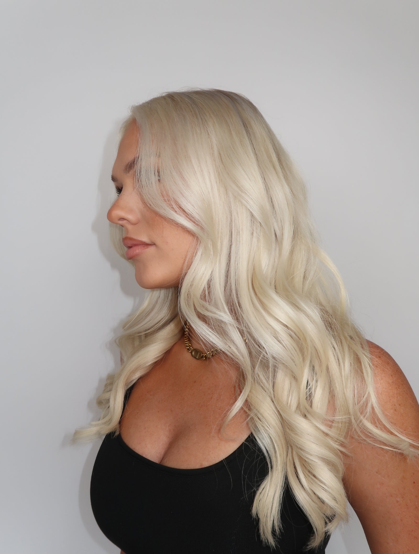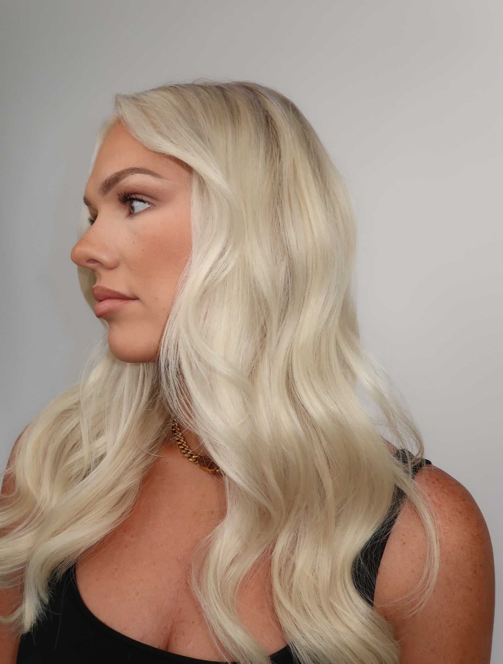 Our brightest untoned blonde with a level 8 root for a seamless blend, our go-to girl.